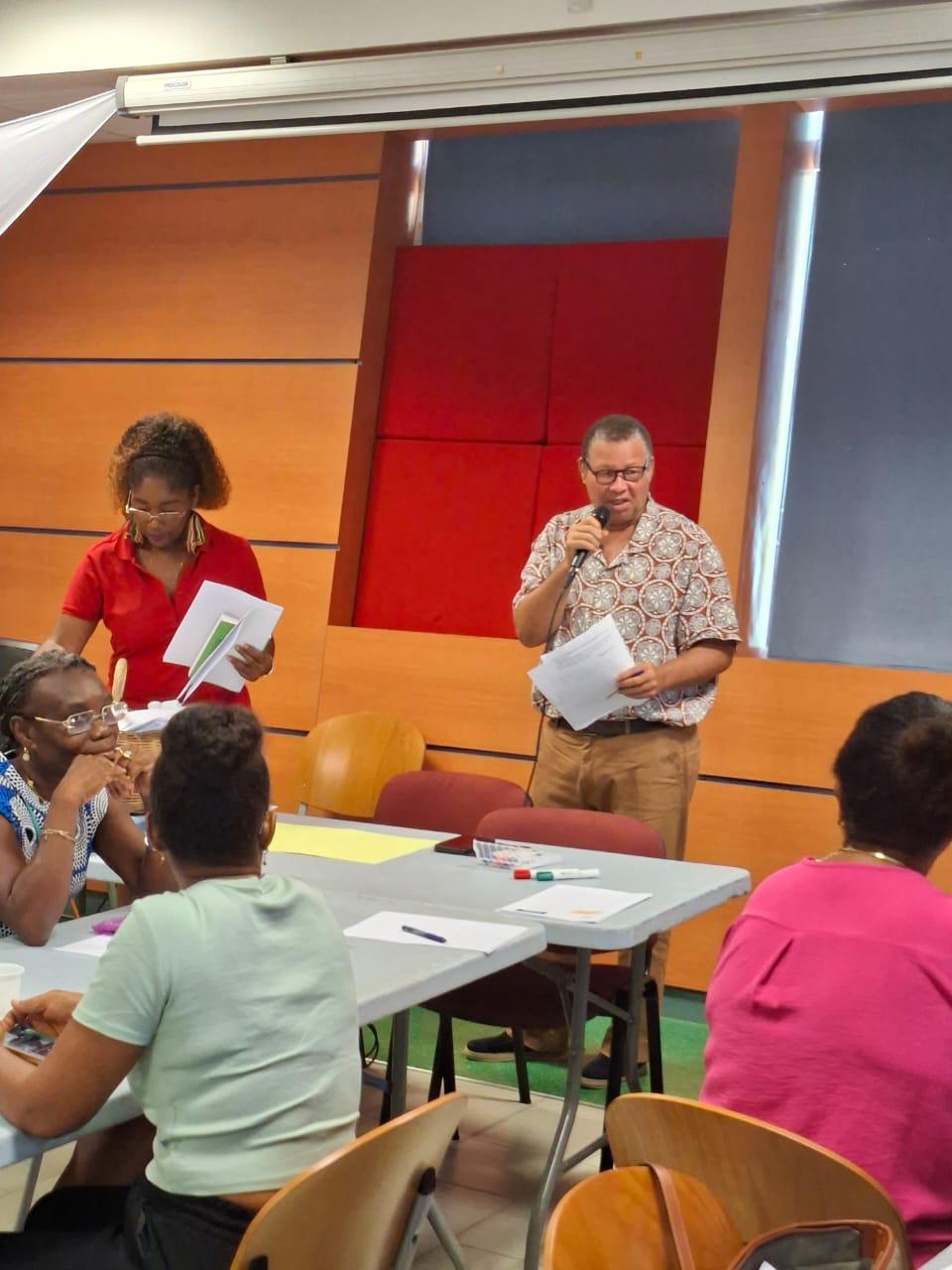 Fidèle à ses engagements en faveur de l’environnement et en première ligne dans le combat contre l’empoisonnement au Chlordécone, Martinique-Écologie a proposé un texte d’actualité brûlante rédigé par l’écrivain et universitaire Raphaël Confiant sur le thème « Agrikilti ek Pestisid ». Une occasion supplémentaire d’enrichir notre langue menacée par une francisation galopante que seul l’écrit pour contrecarrer. Dans le droit fil des travaux du GEREC pour une graphie du créole, Jane Étienne a fait preuve de pédagogie répondant à l’enthousiasme et aux nombreuses questions des participants. Entre exposé sur les origines du créole et tableau à l’appui, cette enseignante d’origine Kalinago a suscité des échanges fructueux où elle a distillé des règles grammaticales et de syntaxe pour le bonheur de tous. Dans l’attente de la correction des copies, Béatrice Joseph et Bruno Dubréas ont assuré une animation improvisée à travers la lecture de poèmes et des chants de notre répertoire créole.